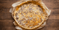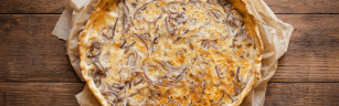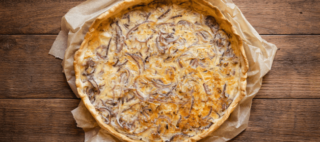 Skiva 4-5 hekto gul och röd lök, krossa och hacka 3-4 vitlöksklyftor och låt mjukna på medelvärme i smör och med lite timjan i en stekpanna. Under tiden vispar du 3 ägg och blandar ner 2-3 dl riven smakrik ost, ett par matskedar grädde (kan uteslutas) och drar ett par rejäla tag med pepparkvarnen och lite salt. Den runda, färdigköpta pajdegen trycker du fast in en pajform eller en springform (båda går lika bra). Blanda ner den varma löken i äggblandningen och bred ut allt i pajskalet (nej du behöver inte förgrädda) och gräddar dryga 20 minuter på 180-200°. KLART!