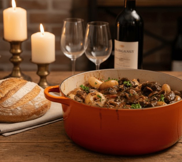 Som ofta är fallet med berömda maträtter, finns det mer än ett sätt att laga en god boeuf bourguignon. Noggrant tillagad och väl smaksatt är den en av de godaste kötträtter människan skapa och passar utmärkt som huvudrätt vid en middag med gående bord. Lyckligtvis kan den lagas helt färdig i förväg, t o m dagen innan, och den vinner bara i smak på att åter värmas upp.