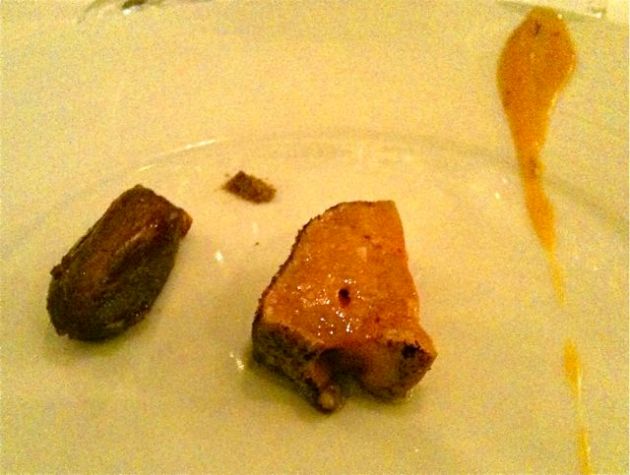 En alldeles strålande liten bit anklever (väldigt PK, ingen tvångsmatad anka), helt ljuvlig. Tillbehören var en dadel som var mycket god för sig själv med totalt slog ihjäl smakerna av levern. ”Karamellsåsen” av bland annat ankfettet var fin, men tyvärr hade köket lagt merparten på det skrovliga tallriksbrämet där den fastnade. Riktigt trist visuell presentation för övrigt.