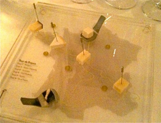 exklusiv glasplatå med en karta av Frankrike komplett med Tour de France-sträckningen inetsad/tryckt. Sex pyttesmå ostar placerade etappvis. Presentationen gjordes av Elfwing alternativt Skarsgård via en iPod. Vi valde, lyckligtvis, Uffe. Stellan kvärpte fram sin presentation på engelska vid grannbordet lite senare. Outhärdligt. Under sport-/ostreferatet avsmakades de små godbitarna. En liten överraskning var ”roqueforten”. En liten mörkbrun gelekub beströdd med pulver. Någon som smakat Estrellas ”Bue Cheese Dressing” utan gräddfilen? Jo, just precis så. Påkostat och gimmickartat.