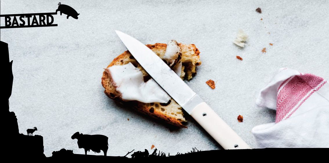Bastardplankan är ett urval av charkuterier på en bräda helt enkelt. Var och en utrustas med en tuff, vass liten kniv (var köper man dem?) och hugger sedan in på godsakerna. Bland delikatsserna märktes särskilt en ljuvligt smakrik och len kaninrillette. Utmärkt start.