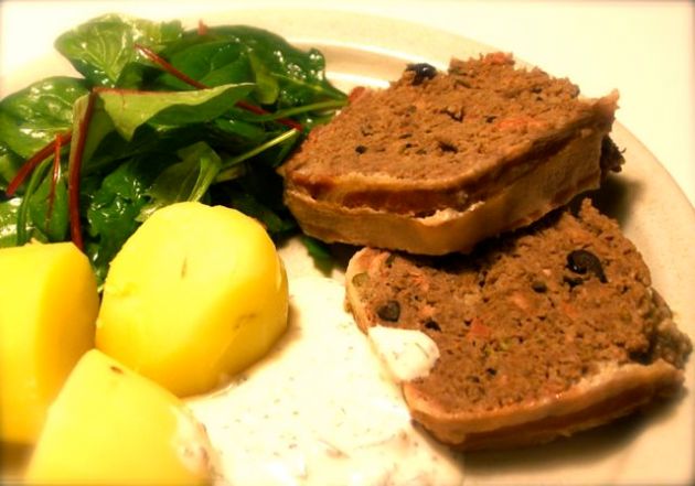 1 dl skorpmjöl rörs ut i 0,5 dl mjölk och 0,5 dl grädde och får svälla en stund. Blanda i 2 ägg, 2 msk dijonsenap, 2 msk kapris, 1 dl grovt hackade svarta oliver, 2 msk  brandy (eller konjak/armagnac/calvados), 2 msk worcestershiresås, 2 msk flingsalt, 1 msk lätt stött grönpeppar, rejält med nymalen svartpeppar och 2 rivna vitlöksklyftor. Mosa ner 2 hg vitlökspaté eller ugnsbakad leverpastej och blanda sedan allt ordentligt med 1 kg nötfärs. Klä en patéform eller en avlång sockerkaksform med tunna baconskivor, (här använder jag faktiskt sladderbacon och inte riktigt bacon) fyll formen med smeten och vik över baconskivorna. Blir det smet över kan du steka biffar. Baka i 150° cirka en timme.