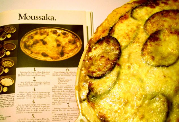 Montering: I en smord ugnsform varvar du aubergine, köttröra, ost och vitsås i den ordningen. Avsluta med vitsås och ost (det krävs mer än en deciliter). Gratinera i 200° i cirka 30 minuter.