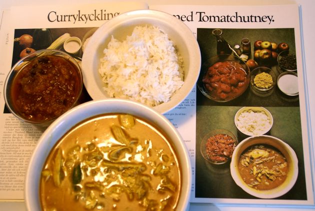 Den här rätten fick tummen upp under söndagsmiddagen. Bra stuns i kryddningen (lite spiskummin skulle jag vilja addera) och en väldigt fin, diskret ton av kokos. Pricken över i var den fånigt lättlagade chutneyn som var riktigt bra med bra balans mellan sötma, sälta, syra, fruktighet och hetta. Tillbehören banan och jordnötter uppskattades och väckte till liv en misstanke om att denna rätt inspirerat till Flygande Jakob vars recept publicerades två år senare.