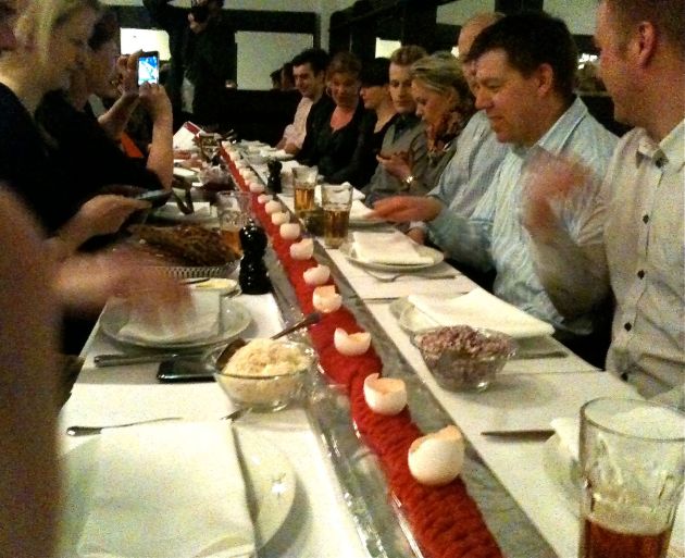 På plats möttes vi av ett långbord uppdukat med en planka där sex meter fint, magert, hackad nötkött konstfärdigt lagts upp med råa äggulor som måttmarkörer på toppen. Genast försökte jag förtränga tankar på salmonella och köttfärsskandaler.