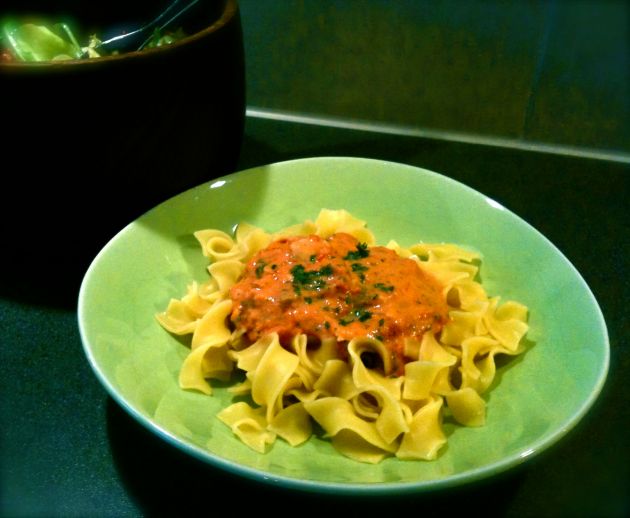 Upprinnelsen till rätten var ett sällsynt restaurangbesök. I början av 80-talet var vi riktigt fattiga och att bli bjudna på krogen var en stor upplevelse. Vi åt på malmökrogen Casa Mia och fick en spännande pastarätt med krämig sås med bland annat rökt lax och tomat.