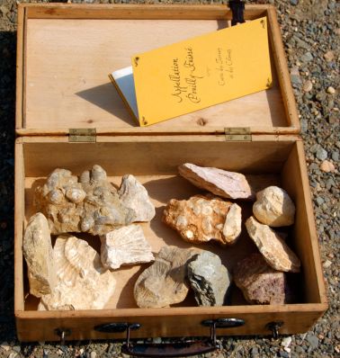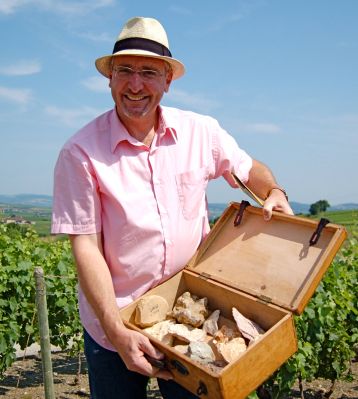 När vi anlände till domänen blev vi välkomnade av de karismatiske Frédéric Marc Burrier som är den sjätte generationen att driva vinmakandet men vars familj funnits i området som vinodlare i fjorton generationer. Här snackar vi kontinuitet. Frédeéric tog oss genast ut i vingårdarna med ett mystiskt träschatull i handen. Vid en utsiktspunkt visade han hur vi befann oss i en veritabel fyrvägskorsning geologiskt sett med Mont Blanc vid horisonten och dessutom i den allra sydligaste delen av Bourgogne ett par stenkast från Beaujolais.Nu tog han dessutom fram sin mystiska låda som visade sig innehålla prov på alla olika mineraltyper som representerade de specifika vingårdarna i området. Otroligt intressant och tydligt.
