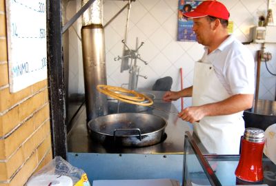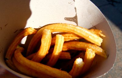 Provade faktiskt för första gången churros som väldigt flinka killar friterar i stora spiraler i kioskerna på gatan utanför marknaden. De arbetar också med den tunga smeten i stora tråg. För tio kronor får man en fettfläckig jättestrut med dessa friterade bakverk som liknar mindre söta munkar med aning sälta och har konsistensen hos perfekt friterade, spröda pommesfrites. Dödligt goda i ordets rätta bemärkelse.