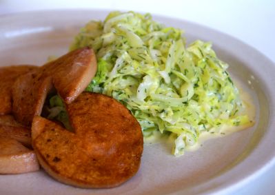 Idag fick det bli en improviserad snabblunch. En väldigt lyckad sådan baserad på resterna av och med inspiration från Carl Butlers piroger. Superenkelt att laga, billigt och himla krispigt, fräscht och nyttigt. Kanon som tillbehör för den som håller på med LCHF eller liknande diet. Jag serverade den dilldoftande kålen till stekt falukorv men tror att den skulle vara en dröm till fisk av olika slag.