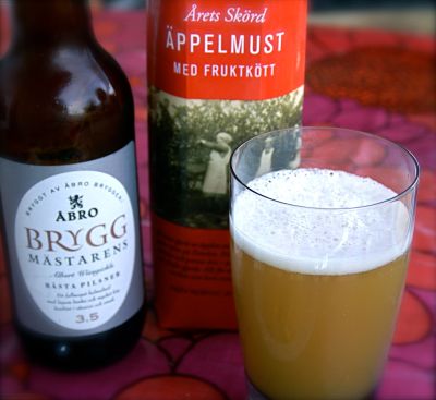 Eftersom jag hade både pilsner och äppelmust hemma så var det den enklast sak i världen att testa. Jag bottnade glaset med en del grumlig äppelmust och toppade med tre delar ljus pilsner. Resultatet blev en matig, svalkande måltidsdryck med syrlig ton balanserad av sötma och en liten beska från ölen. Maltigheten och äppelfruktigheten samspelade mycket bra.