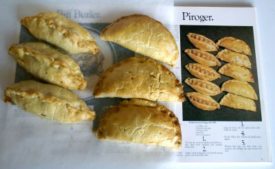 De här receptet är helt klart inspirerat av ryska recept. Däremot är det väl lite oortodoxt att använda pajdeg när man ska göra piroger, vilket också Carl Butler medger. Men det är något skumt med Calles ryska recept. Båda två (här är det andra) han har med i boken innehåller nämligen fiskpinnar! Mycket märkligt.
