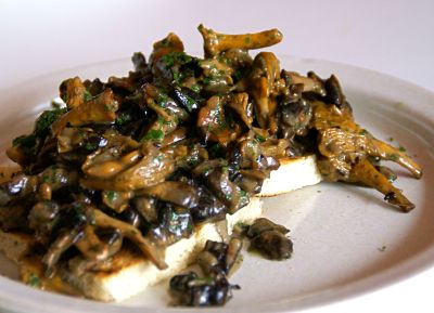 Till 2 rejäla lunchportioner eller 4 fjompiga förrätter: Ungefär en liter grovt nedskurna champinjoner (köp de utslagna och lätt skrumpna som det är mer smak och mindre vatten i) och drygt en halvliter rivna kantareller. Skär kanterna av 4 skivor toastbröd och rosta i torr stekpanna eller brödrost. Stek champinjonerna i torr stekpanna på ganska hög värme så att det mesta av vattnet avdunstar. Det blir ganska svart och dant men mycket smak. Släng i MASSOR med smör och fräs. Addera kantarellerna och en fint hackad schalottenlök. När kantarellerna sloknar och börjar tappa vätska slår du på 2 msk olorososherry (konjak eller brandy funkar också) som får koka in några minuter. I småskvättar adderar du nu ungefär 2 dl vispgrädde. Det ska koka in, reducera och bli krämigt. Smaksätt med salt och svartpeppar, riv över lite (eller mycket) parmesan och rör sist ned finhackad persilja. Häll svampgeggan över brödet och njut!