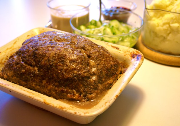 Blanda samman 1 dl ströbröd, 1 dl gräddmjölk, 2 ägg, 200 g leverpastej, 5-6 sardeller, 1 msk worcestershiresauce, 1 tsk salt och svartpeppar till en jämn smet. Blanda denna väl med 1 kg köttfärs (jag använder 1/3 fläsk och 3/4 nöt) och forma till en limpa i en form. Stek i ugn på 150° i cirka 90 minuter. Ta ut köttfärslimpan och häll/ös ut spadet i en gryta och hetta upp under omrörning och vispa ned matlagningsgrädde. Smaka av gräddsåsen med soja och peppar och red eventuellt av med lite maizena. Servera med potatismos, lingonsylt och den omistliga pressgurkan.