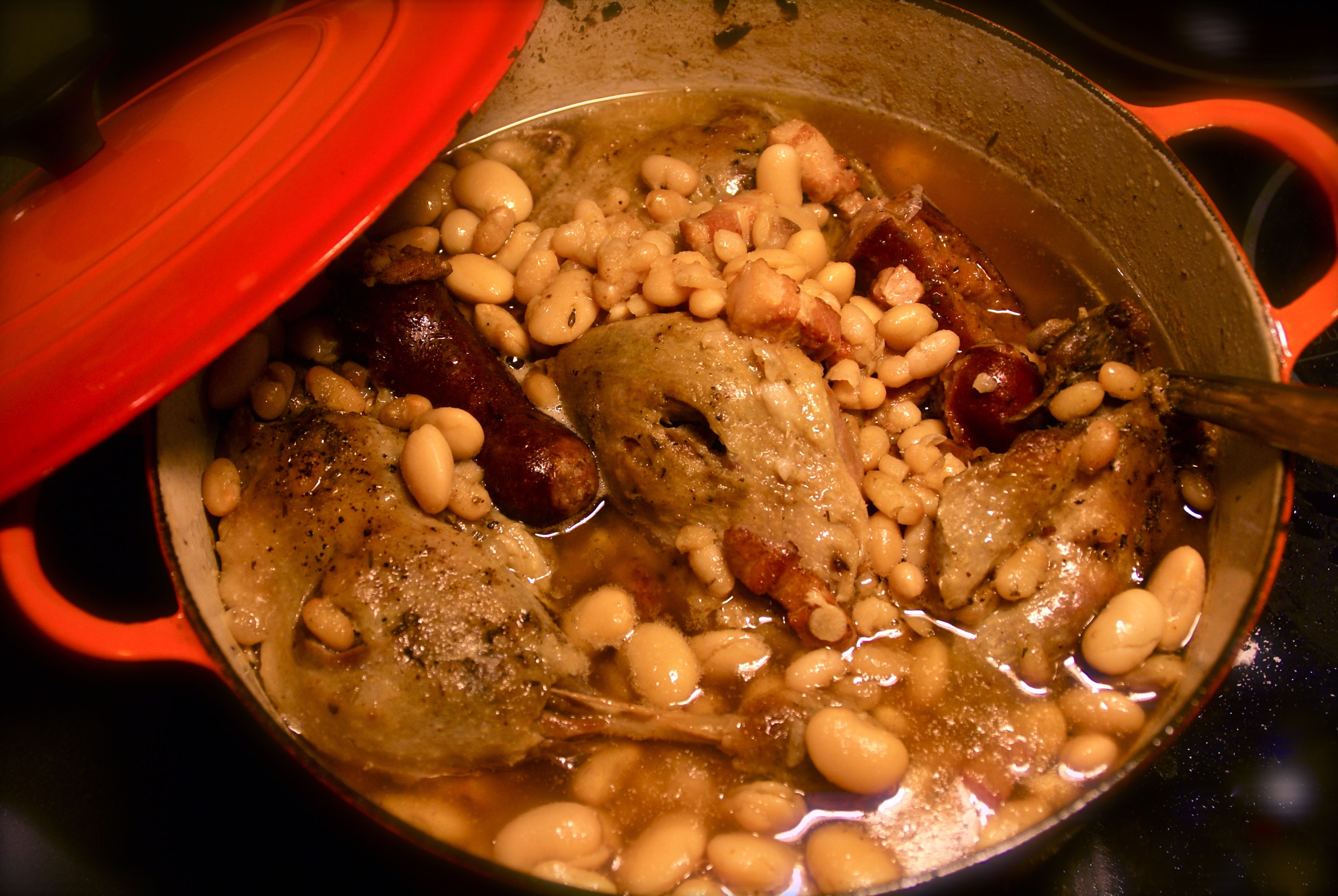 I en tjockbottnad gryta eller ugnsform med lock lägger du det väl tvättade skalet av en apelsin och ovanpå varvar du bönor, korv, fläsk och lök/svålmix och avslutar med de confiterade anklåren. Slå på kokspadet (kontrollera så sältan är bra) så det precis täcker bönorna.