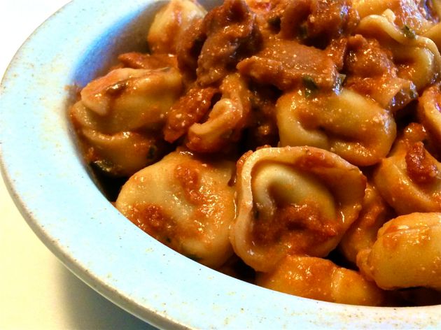 Medan pastan (torr tortellini i mitt fall) klipper du ner ett paket bacon i en het stekpanna och fräser tills den fått färg. Slå över en burk krossade tomater och 100 g fetaost som du tärnat/hackat/smulat och låt puttra medan pastan kokar färdigt. Smaksätt med några rejäla stänk tabasco. Häll vattnet av pastan som du sedan vänder ner i såsen. That’s it!