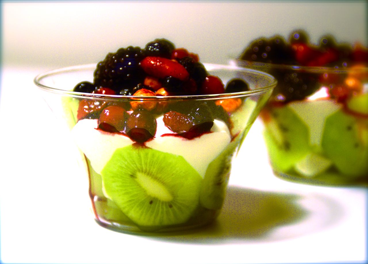 Jag sockrade bara de tinade bären något och toppade den naturella smetanan som låg på en bädd av skivad kiwi. Bären var ganska sura och några rent av beska, men den milda, feta smetanan med sin lite nötiga smak och nästan sega konsistens fungerade fantastiskt bra som komplement.