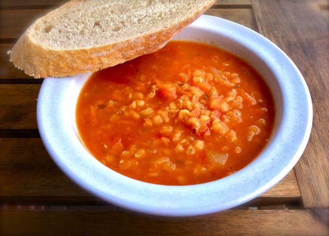 Hacka en stor, gul lök och grovriv en stor morot och fräs detta mjukt i massor med olivolja tillsammans med 1 msk spiskummin. Slå på 1 liter vatten, 3 poddar/tärningar grönsaksbuljong, en burk krossade tomater och 2,5 dl röda linser. Låt sjuda i 20 minuter. Pressa i 2 vitlöksklyftor, samt blanda ner det finrivna skalet och saften av en halv citron. Smaka eventuellt av med lite salt och några stänk tabasco.
