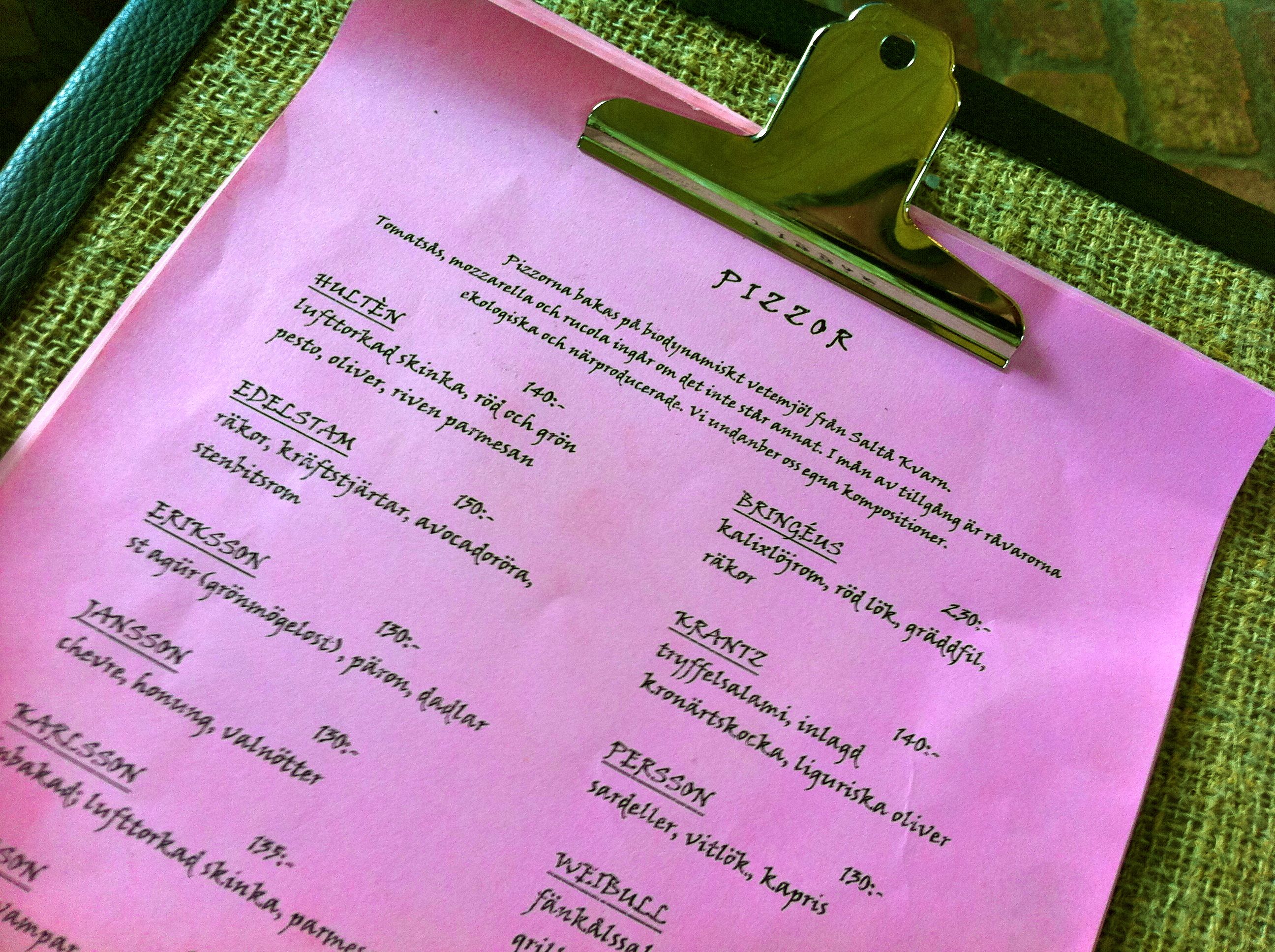 Pizzorna bär efternamn och har ingredienser som får både det ena och andra ögonbrynet att lyftas. Jag får känslan av att de är som smakrika tallrikar av bröd mer än traditionella pizzor. Det är personligt, lokalt, ekologiskt och hög kvalitet. Pizzorna (Hultén och Weibull) som bars hem smakade fantastiskt bra med en helt ljuvlig, välgräddad och luftig botten. Nästa gång ska vi definitivt äta maten på plats, njuta av stämningen, miljön, de specialimporterade vinerna och den egentillverkade musten och äppelspriten. Men vi ska följa rådet att boka bord. Här blir snabbt fullsatt.