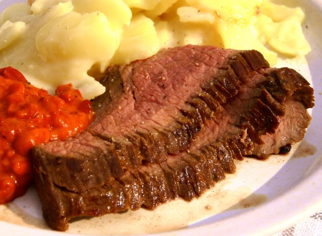 Flanksteken är inte någon särskilt vanlig styckdetalj i Sverige, men dyker upp ibland så här under grillsäsongen då det är ett ganska tunt och jämnt köttstycke som lämpar sig väl på grillen. Köttet är magert och kan lätt bli segt om man inte hanterar det rätt. Det ska helst marineras (se mitt förslag nedan) och grillas snabbt på hög värme så att det blir vackert rosa inuti. Sedan måste det skäras mot fiberriktningen och gärna snett och i tunna skivor ungefär som en gravad lax. Gör man på detta sätt blir det ett smakrikt, mört och saftigt kött inte helt olikt en fin rostbiff.