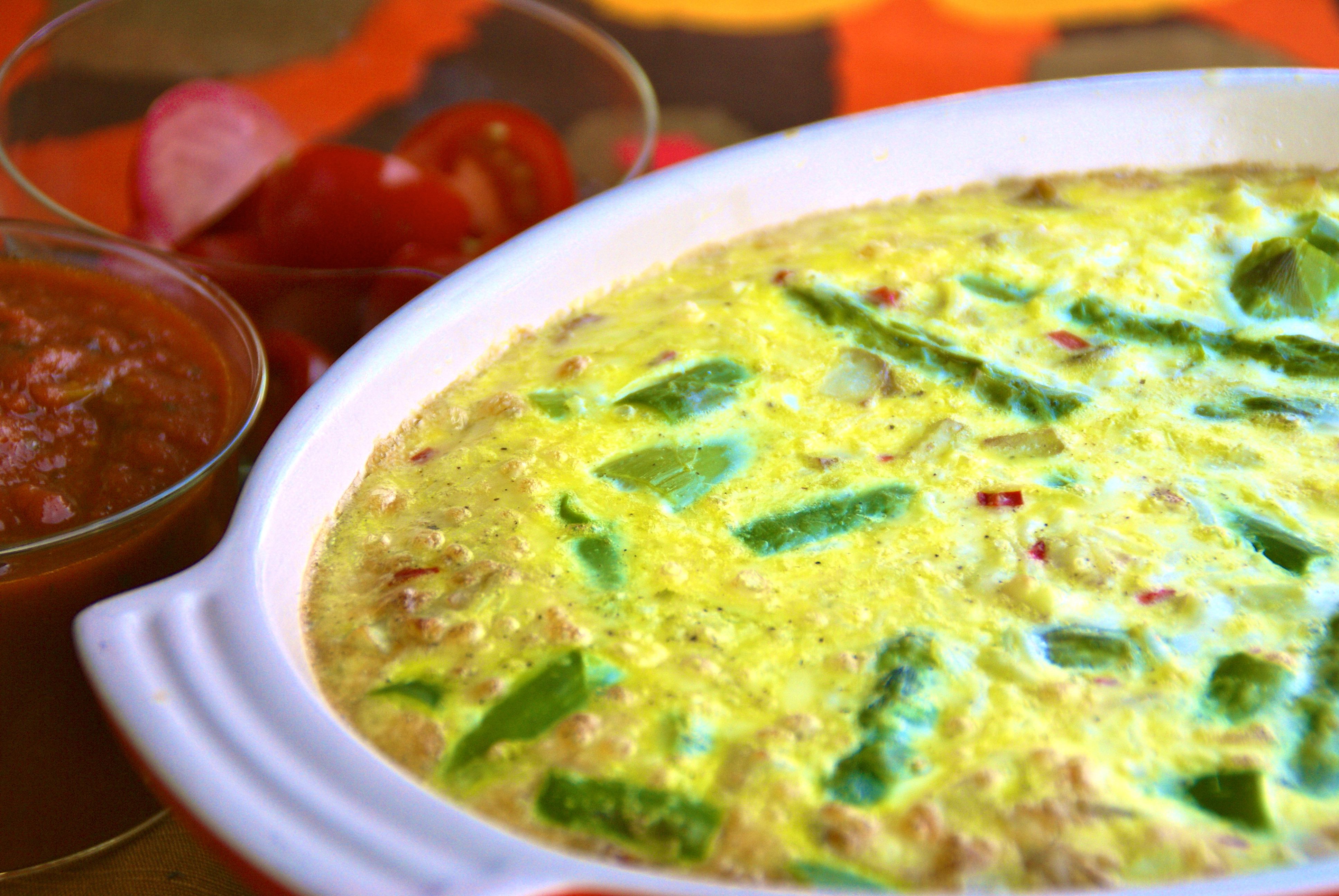 Koka en knapp deciliter ris. Koka 4 medelstora potatisar (ca 300 g) med skal knappt 10 minuter. Skala potatisarna och tärna ganska fint och stek gyllenbrunt tillsammans med en skivad vitlöksklyfta och ställ åt sidan. Koka 250-300 g grön sparris några minuter och skär i bitar. Vispa samman 10 ägg med 50 g riven parmesanost och 2 dl riven grevéost eller liknande. Blanda ner potatisen, riset, sparrisen samt en finskuren, halv mild chilifrukt och smaksätt med 1 tsk salt och rejält med nymalen svartpeppar. Häll smeten i en smord ugnsform som du ställer i en vattenfylld braspanna i ugnen på 175° i ungefär 45 minuter. Servera med en tomatsås som du kokat ihop på krossade tomater, några sardeller och skivade oliver. Eller varför inte en ratatouille.