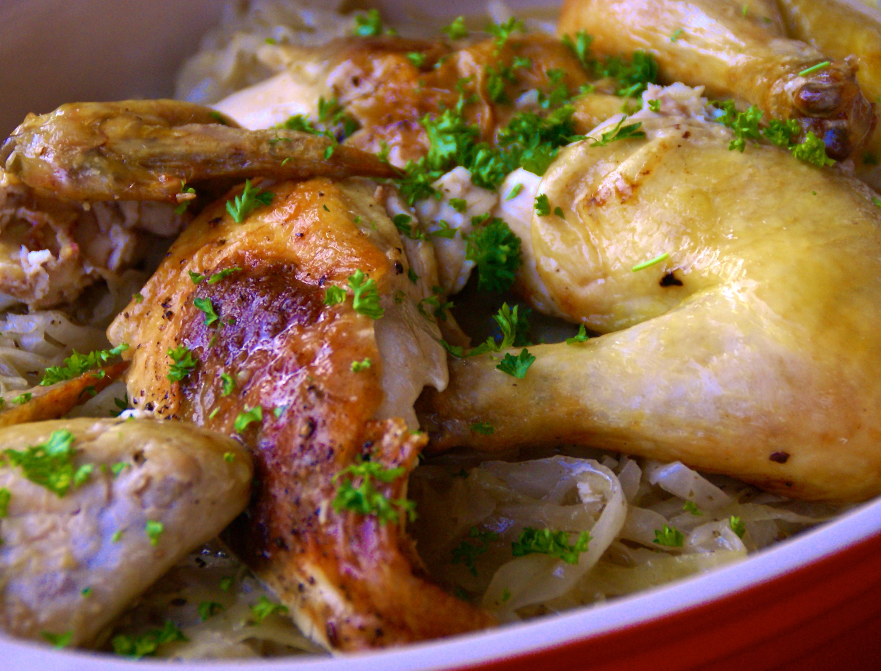 Skär upp kycklingen, lägg den på en bädd av vitkålen och ringla över en del av såsen. Servera med en grönsallad och eventuellt lite kokt potatis, annars räcker det gott med vitkålen.