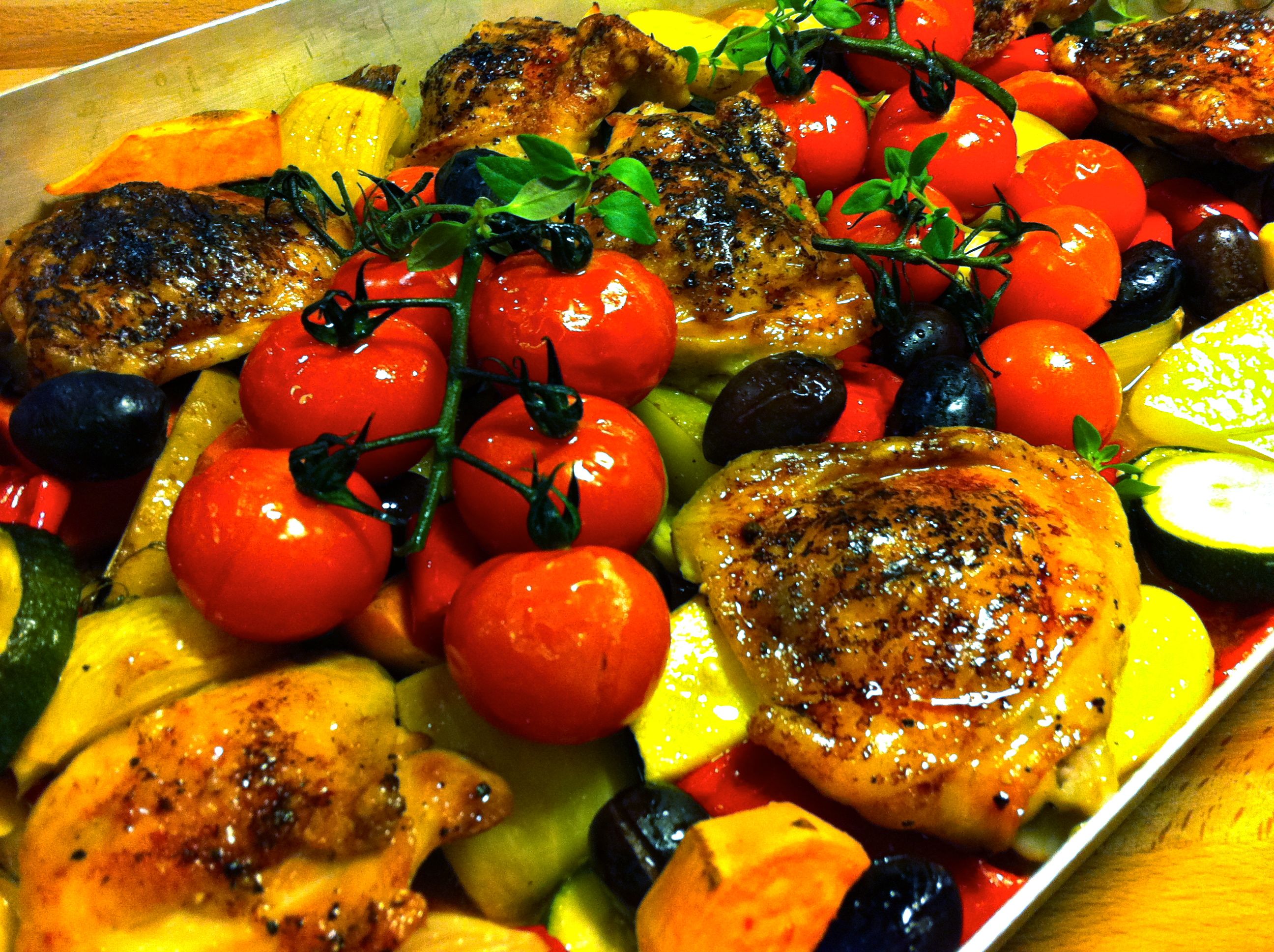 Tvätta och halvera 10 små, fina potatisar. Skala 3 morötter, 2 sötpotatisar och en palsternacka och dela i bitar. Skala och klyfta 3 små gula lökar. Skär en liten zucchini och två spetspaprikor i tjocka skivor. Skala och halvera 4 vitlöksklyftor på längden. Lägg allt tillsammans med några timjanskvistar och 800-1000 g kyckling i bitar (kycklinglår är billigt och smakrikt) i en stor form eller braspanna. Ringla över rikligt med olivolja, häll på 2,5 dl vitt vin, salta och peppra och blanda samman allt. Placera kycklingbitarna överst med skinnsidan upp. Skjutsa in ganska högt upp i ugnen på 200° övervärme och ös och rör om lite då och då. Efter en timme tar du ut formen, dräller över svarta oliver och lägger ut ett par kvistar körsbärstomater. In i ugnen i en halvtimme till och fortsätt ösa.