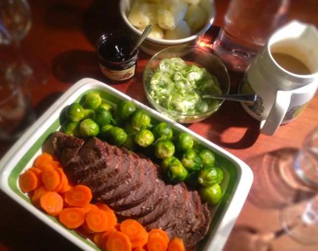 Jag har nog inte ätit söndagsstek sedan jag var liten, men ändå lever minnet kvar. Kokta morötter, brysselkål, pressgurka, vinbärsgelé och mjölig potatis som man mosade ihop med den smaskiga gräddsåsen. Köttet minns jag som torrt och lite segt och var ganska oviktigt.