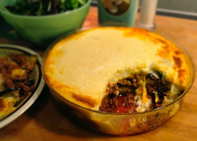 Varva aubergine och köttfärssås i en smord form och avsluta med ostsåsen. Grädda i ugn på 200° i cirka 30 minuter. Njut med en sallad och ett torrt vitt vin, gärna grekiskt förstås.