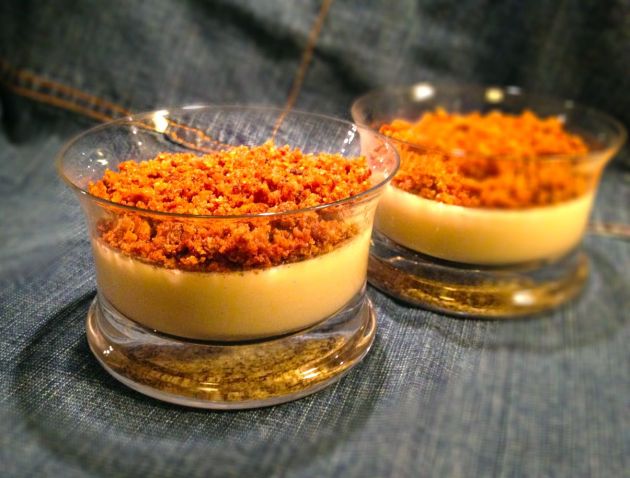 Mixa kavring (cirka 3 skivor) så du får 1 dl fina smulor och blanda med 1 dl ljust ströbröd och 1 tsk kanel. Smält minst 50 g smör i en stekpanna och fräs brödsmulorna. Blanda ner 0,5 dl farinsocker och fräs till knaprigt och börjar ta färg. Låt svalna innan du toppar pannacottan med krispet.