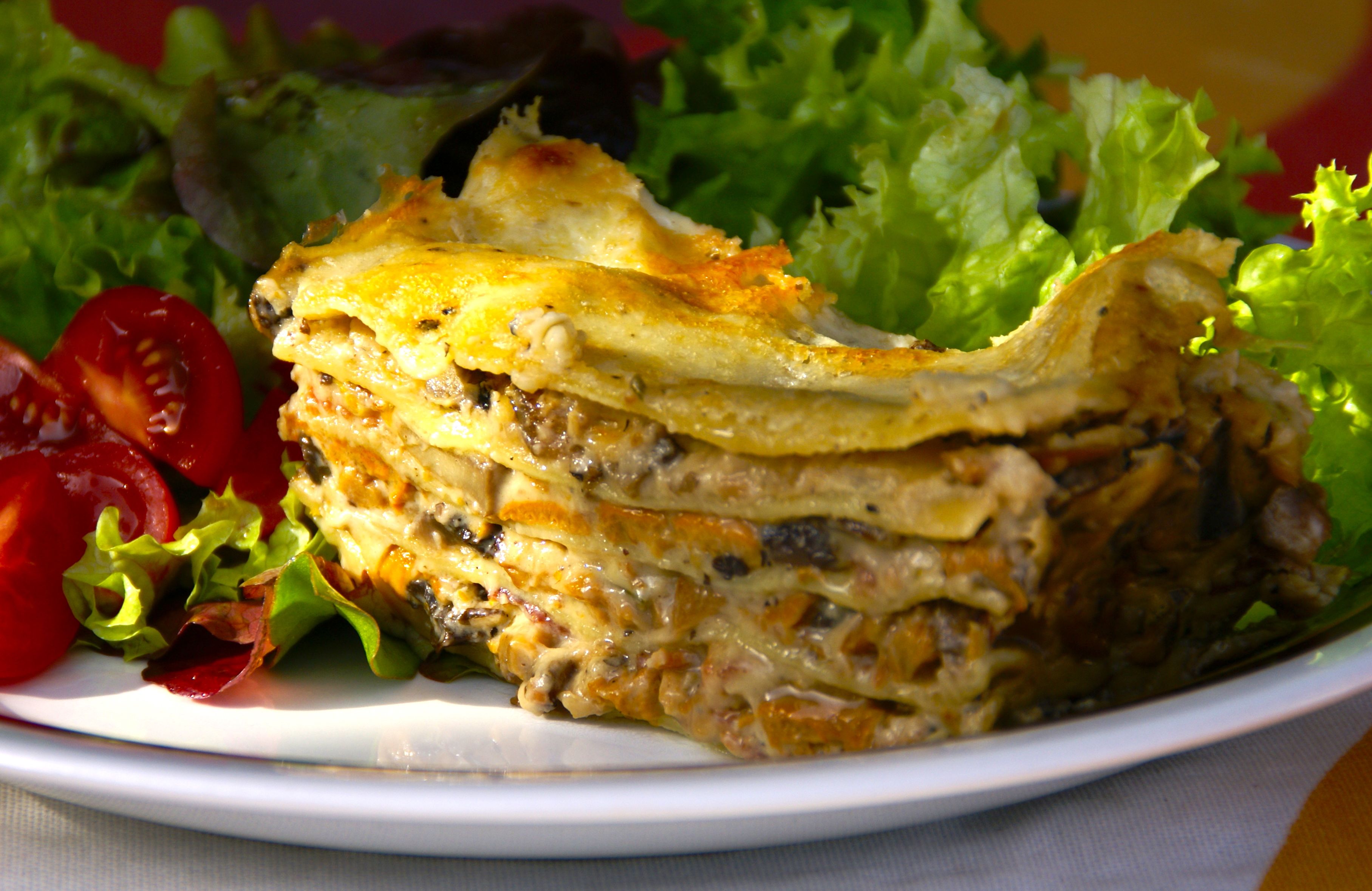 Montering: Den sparade såsen spär du ut med 1 dl mjölk och värmer upp. Klä en avlång sockerkaksform med bakplåtspapper som du smörar lätt. Bottna formen med lite av såsen, täck bottnen med två lasagneplattor och bred ut en fjärdedel av fyllningen. Lägg på ytterligare två lasagneplattor och så vidare. Avsluta med ett lager plattor, resten av den utspädda såsen och riv över mer parmesan/pecorino. Grädda på 200° i 45 minuter. Låt svalna i en halvtimme innan du med hjälp av bakplåtspappret lyfter upp lasagnen ur formen och skär fina skivor.