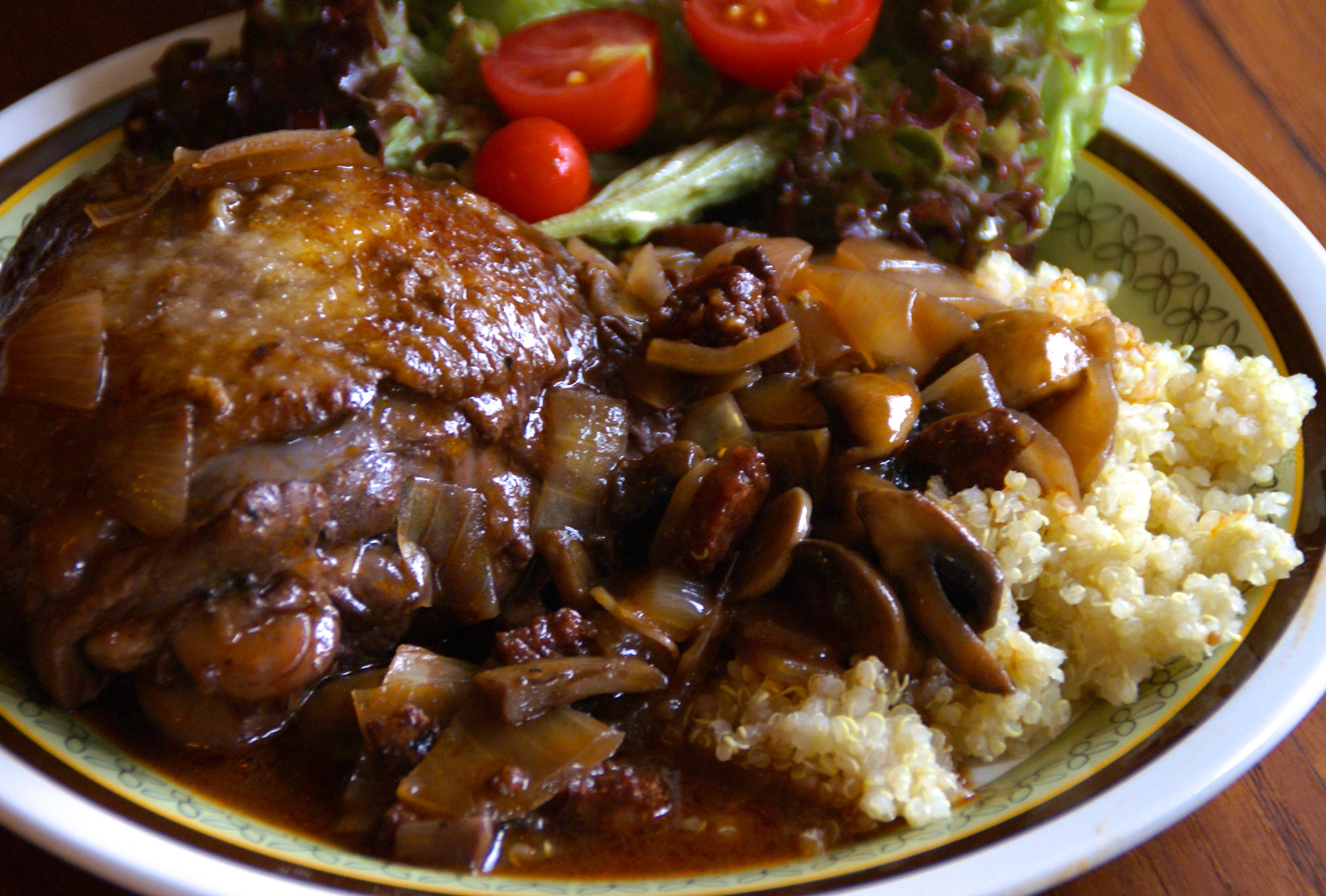 Hetta upp fett (smör, olja eller ister) i en stor gjutjärnsgryta och bryn 1500 g tupplår (eller andra styckdelar av kyckling). Ta upp och lägg åt sida. Bryn 200 g champinjoner som du klyftat tills de börjar ta färg. Ta upp och lägg åt sidan. Bryn 400 g grovt hackad gul lök tills den börjar mjukna och ta färg. Släng ner 100 g chorizo (hetta efter smak)av den torra sorten i tunna skivor samt 5 vitlöksklyftor som du skivat tunt. Fräs några minuter. Lägg ner kycklingen och champinjonerna. Klicka ner 3 msk tomatpure, 1,5 msk kycklingfond eller en buljongpod och häll över 5 dl rött vin. Låt koka upp och sjud sedan sakta under lock i 45 minuter. Ta upp kycklingen/tuppen. Vispa ut 3 msk vetemjöl i lite olivolja och rör ned blandningen i grytan. Låt sjuda under omrörning några minuter, smaka av med salt, peppar och pressad citron. Lägg sedan tillbaka köttet. Servera med ris eller potatis och sallad.