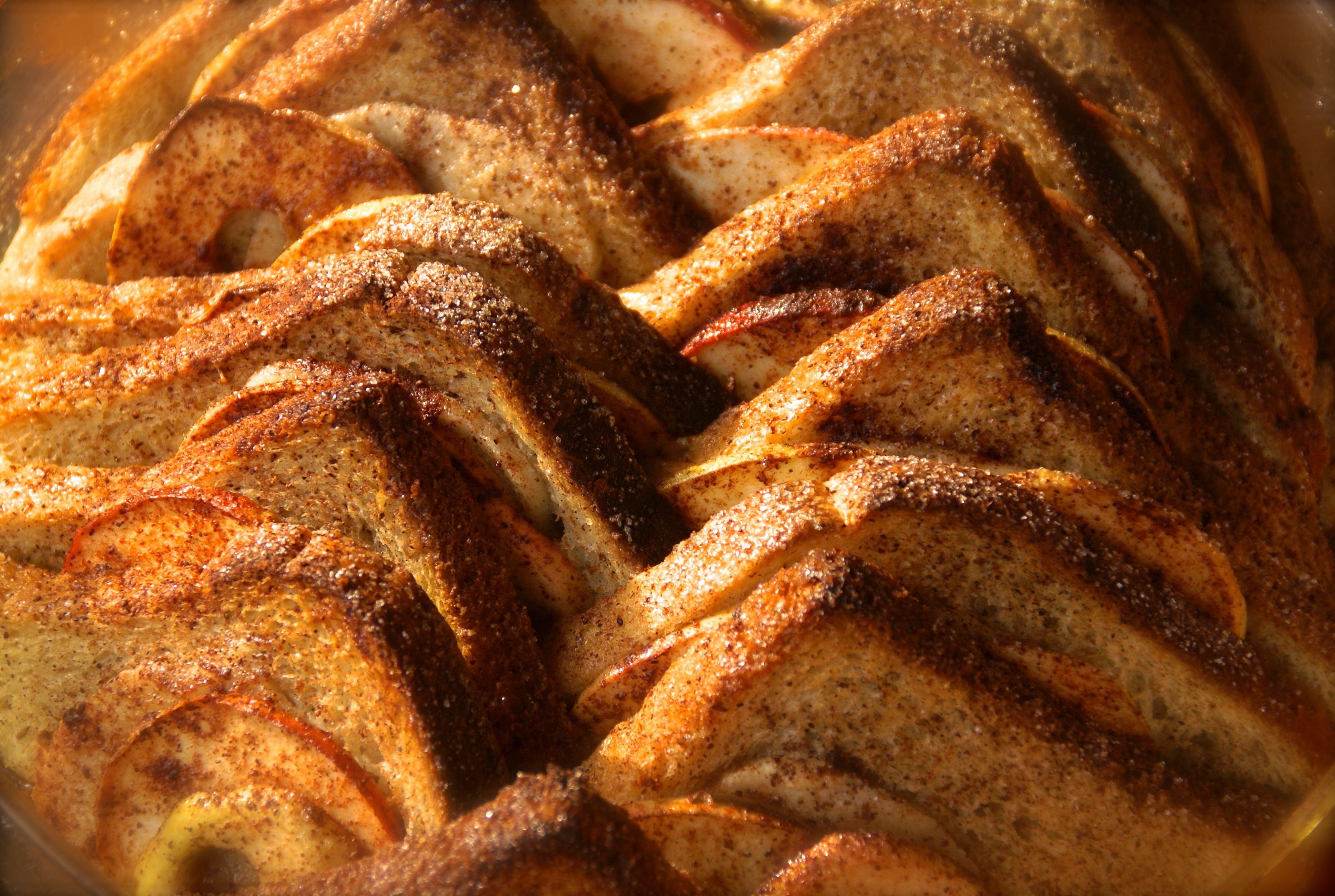 Kärna ur 4 små svenska äpplen och skär dem i tunna skivor. Lägg äppelskivorna i en bunke med 0,5 msk kanel och 2 msk socker och blanda väl. Dela 8 skivor formfranska på diagonalen och skär 16 tunna skivor från en rulle mandelmassa. Vispa samman 4 ägg, 2 dl mjölk, 2 msk socker och o,5 msk kanel. Smöra en form och täck bottnen med ett tunt lager äpplen. Doppa brödskivorna i äggsmeten och varva dem stående i formen med äppelskivor och mandelmassa. Häll över eventuellt överbliven äggröra. Pensla allt med smält smör, strö över lite socker och pudra över lite kanel. Grädda på 200° i ungefär 45 minuter. Låt svalna något och servera med vaniljsås.