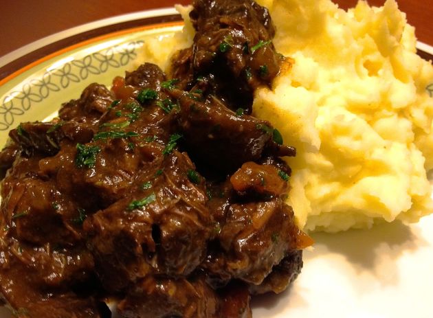 Skär 800-1000 g högrev eller fransyska i grytbitar, lägg i en bunke, salta, peppra, pudra över 2-3 msk vetemjöl och vänd runt tills väl blandat. Klyfta 300-400 g champinjoner, grovhacka en stor gul lök och skär en selleristjälk och två morötter i bitar.  Stek svampen i en torr gjutjärnsgryta tills de tappat vätskan och börjat få färg. Klicka i smör och fortsätt fräsa tills de fått en djup gyllenbrun färg. Ta upp svampen, klicka i mer smör i grytan och fräs de andra grönsakerna tills de börjar få lite färg och mjuknar något. Ta upp grönsakerna, i med mer smör och stek köttet i omgångar så det blir ordentligt brynt runt om. Slå på 3 dl rött vin och 2 dl vatten och vispa runt så allt det goda från bottnen löses upp. Släng ner alla ingredienser samt en oxbuljongtärning/fond/pod, 2 hela vitlöksklyftor och 2 lagerblad och låt få ett uppkok. På med locket och ställ i ugn på 150° i minst 3 timmar. Smaka av med salt och peppar och servera med potatismos.