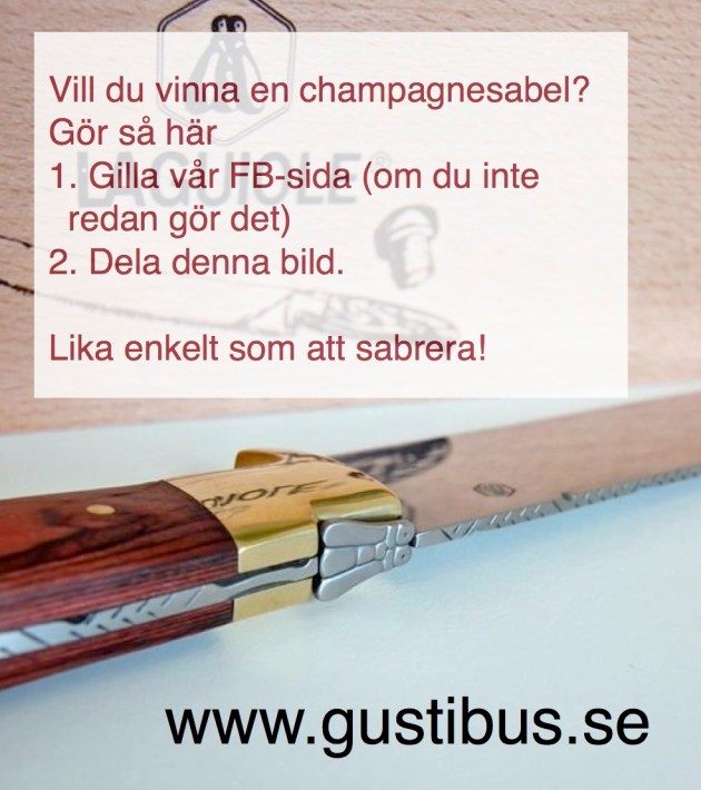 Just nu kör vi en liten marknadsföringskampanj. Om du gillar vår facebooksida samt delar denna bild med dina vänner så deltar du i utlottningen av en champagnesabel.