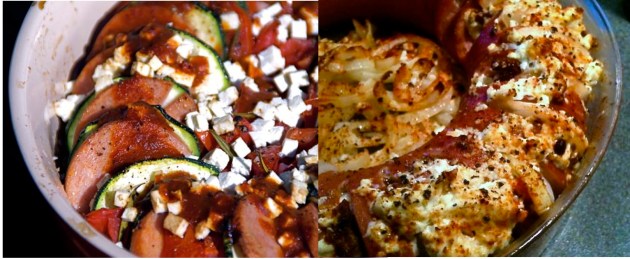 Skivad zucchini, falukorv och stora mogna tomater varvades i en ugnsform som bottnats med olivolja. Toppades med rejäla tag med pepparkvarnen, några nypor flingsalt, färsk rosmarin och fint tärnad fetaost. Ändarna och stumparna av tomaterna hackades och lades i mitten av formen. Sist ringlade jag över lite olivolja. 25 minuter i ugnen på 200°. Jag tyckte det såg lite torrt ut så jag klickade över min apelsinketchup när lådan nästan gått färdigt. Kan ersättas med en smakrik passata, tomatsås, chilisås eller uteslutas helt. Servera rätten som den är eller med ett gott bröd att suga upp den goda skyn med och eventuellt en sallad.