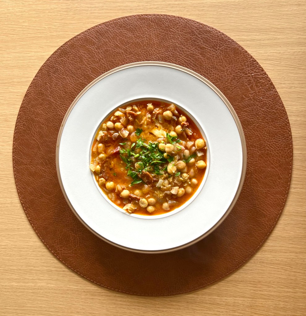 Tärna/strimla en riktigt fet bit rimmat eller kallrökt fläsk (jag hade en bit gunciale hemma), skär ett par decimeter chorizo dulce(den torra chorizovarianten med paprika) i tunna slantar, grovhacka en gul lök och krossa 2-3 vitlöksklyftor. Lägg fläsket och chorizon i kall gryta med en skvätt olivolja. Vrid upp till medelvärme och lått det mesta av fettet i fläsket svettas ut. Ner med lök och vitlök och låt den mjukna i värmen. Slå på 1,5 dl finosherry och lått puttra en stund. Häll av vattnet från två burkar kikärtor och mosa till hälften med en potatisstöt. Ner med kikärtorna i grytan tillsammans med 5 dl vatten och en buljongtärning (höns eller ox). Låt allt sjuda cirka 20 minuter. Smaka av, sleva upp i tallrikar och ringla över olivolja.