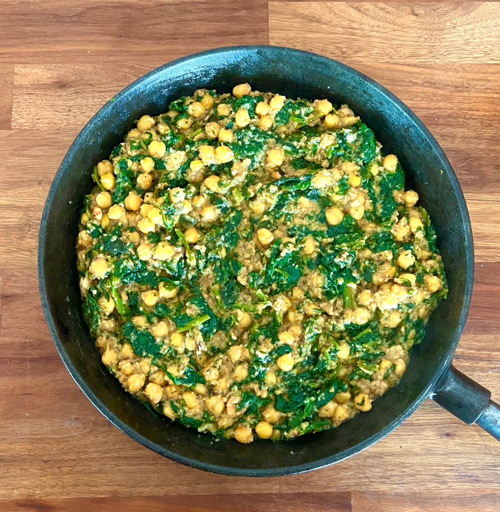 Lägg 2 dl kikärtor i blöt över natten. Koka i nytt saltat vatten i ungefär 30 minuter. Du kan förstås göra receptet på konserverad kikärtor men det blir lite mosigare. Stek 2 skivor vitt bröd i lite olivolja och mixa det till fina smulor tillsammans med 0,5 dl marconamandlar (eller vanliga skållade mandlar) och två skalade vitlöksklyftor. Tina 200 g frusen bladspenat och krama ut det mesta av vattnet. Fräs 1 tsk stött kummin, 1 tsk malen koriander, 1 tsk rökt paprikapulver (finns också hos Salamantinos) och chiliflakes efter smak i rikligt med olivolja på svag värme några minuter. Vänd ner allt i kryddoljan i stekpannan tillsammans med en matsked sherryvinäger och 2 dl av kokvattnet från kikärtorna. Låt puttra 10-15 minuter och smaka av med salt och peppar.