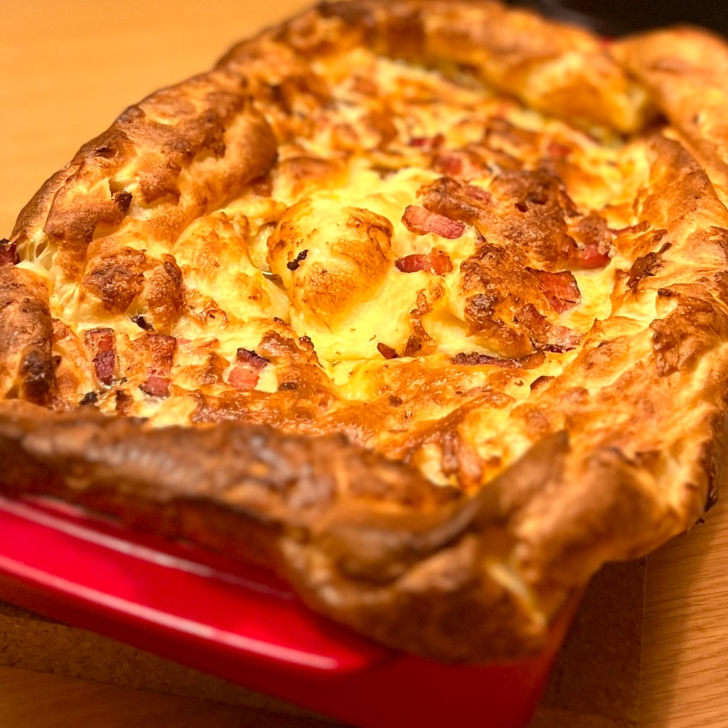 Vispa ihop 4 dl vetemjöl och 0,5 tsk salt, 1,5 tsk bakpulver (kan uteslutas) med 4 dl mjölk tills du får en riktigt slät smet. Knäck i 4-5 ägg och blanda väl. Rör nu ned ytterligare 4 dl mjölk. Skär 2 hg rökt sidfläsk i stavar/strimlor och stek i torr panna tills de är riktigt knaperstekta. Ställ in den tomma formen i ugn på 225° tills den är riktigt het. Bäst med en form i keramik/porslin eller emalj som håller värmen bäst. Ta ut och släng i en rejäl klick med smör och en slatt med matolja. och pensla hela formen. In med formen i ugnen igen ett par minuter så formen åter blir riktigt het. Tag ut formen och slå snabbt i smeten och strö över fläsket. In i ugnen i cirka 30 minuter.