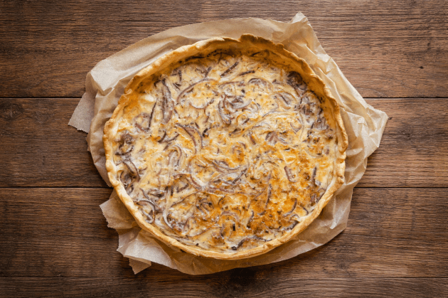 Skiva 4-5 hekto gul och röd lök, krossa och hacka 3-4 vitlöksklyftor och låt mjukna på medelvärme i smör och med lite timjan i en stekpanna. Under tiden vispar du 3 ägg och blandar ner 2-3 dl riven smakrik ost, ett par matskedar grädde (kan uteslutas) och drar ett par rejäla tag med pepparkvarnen och lite salt. Den runda, färdigköpta pajdegen trycker du fast in en pajform eller en springform (båda går lika bra). Blanda ner den varma löken i äggblandningen och bred ut allt i pajskalet (nej du behöver inte förgrädda) och gräddar dryga 20 minuter på 180-200°. KLART!