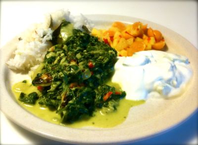Skiva 250 gr halloumiost och stek så de får en ganska rejäl stekyta. Lägg åt sidan. Hacka en gul lök och fräs i olivolja så att den mjuknar men inte tar färg. Lägg i 2 hackade vitlöksklyftor och cirka 3 msk grovriven ingefära och 2 st finhackade röd spansk peppar. Fräs en stund till och blanda sedan ner 450 gr hel bladspenat (fryst och upptinad) och 2 msk senapsfrön. Värm upp och tillsätt 2 dl matlagningsgrädde. Låt puttra en stund. Färgsätt med gurkmeja och smaksätt med en skvätt vinäger, 2 tsk salt, svartpeppar och 1 msk råsocker. Smaka av. Innan servering vänder du ner halloumin och värmer på den. Servera med ris.