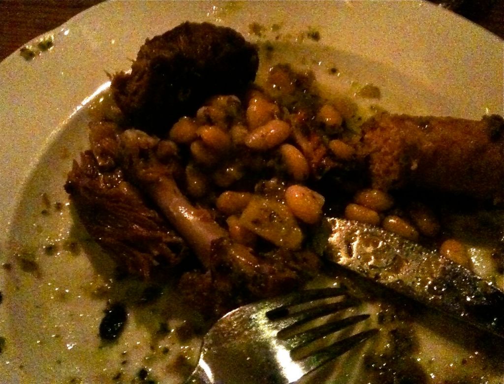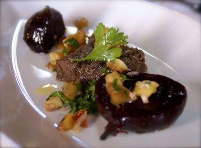 Varmrätten var ett perfekt tillagat ankbröst på en broccolipuré med fint balanserad sälta och väl utvecklad smak av broccolin. Till det serverades ett savoykålsknyte fylld med ankrillette och ett potatisstomp med en fin syrlighet av citron. På det lilla knytet, som var en perfekt liten rätt i sig, låg en bit halstrad anklever som smälte bara jag tittade på den. Allt var mycket, mycket välbalanserat. Enda plumpen var ett pulver (!) på ankfett, fullständigt överflödigt och obegripligt. Vinet tappade all karaktär, blev eldigt och försvann. Provade istället rieslingen som kom till sin rätt och blev fruktigt och syran balanserades vackert mot den lilla syran i moset och skyn.
