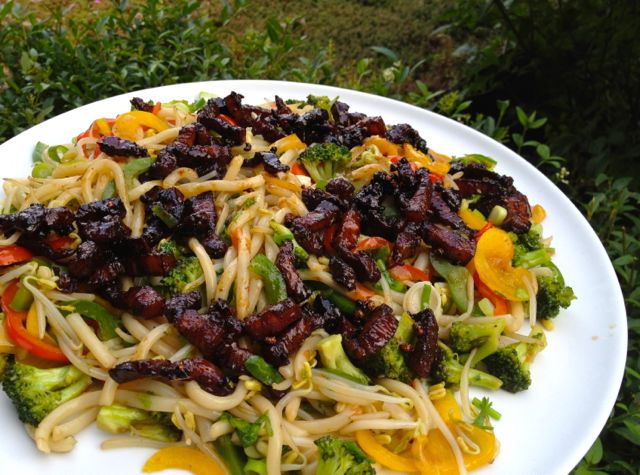 Servera med ris eller i ett pitabröd med sallad. Jag kokade äggnudlar och slänge ner en fisnstrimlad tomat och vårlök den sista minuten, hällde av vattnet och blandade ner en skvätt ljus soja och sesamolja.