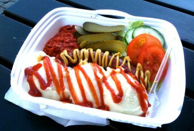 På bilden ser du en ungersk korv med mos, ajvar och saltgurka som jag tröståt i desperation hos Orvars Korvar. Är man ute och festar så hamnar man alltid här eller hos Stippes. Båda legendariska snabbmatsställen. Orvars har enligt ihärdiga rykten aldrig stängt sin lucka under de mer än 35 år som stället funnits. Helgdagar, strömavbrott eller översvämning har inte stoppat utfodringen av hungriga malmöbor. Dygnet runt, året om alltid öppet.