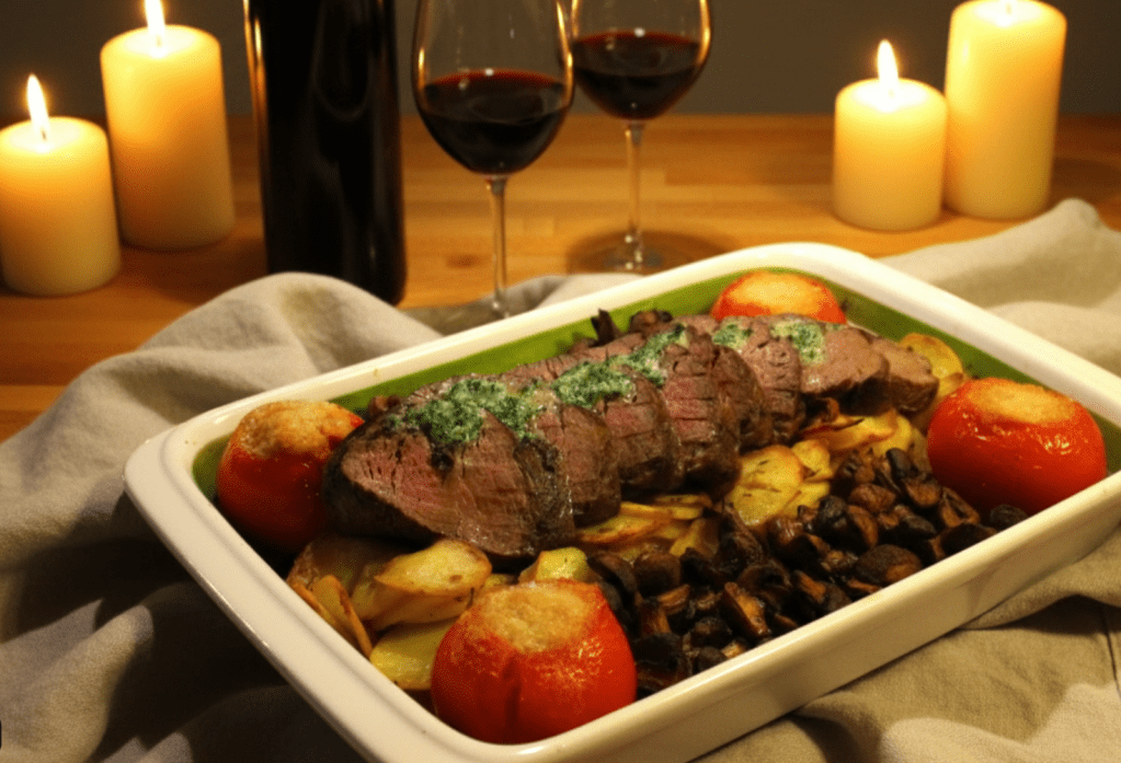 Det är en rätt enkel rätt egentligen. Helt enkelt råstekt potatis, helstekt oxfilé och vitlökssmör. Fast med mycket smör, massor med vitlök, mört kött och gyllenstekt potatis behöver man inte så mycket mer. Dessutom praktiskt bjudrätt då den går att förbereda helt och hållet och bara värmas upp när gästerna kommer.