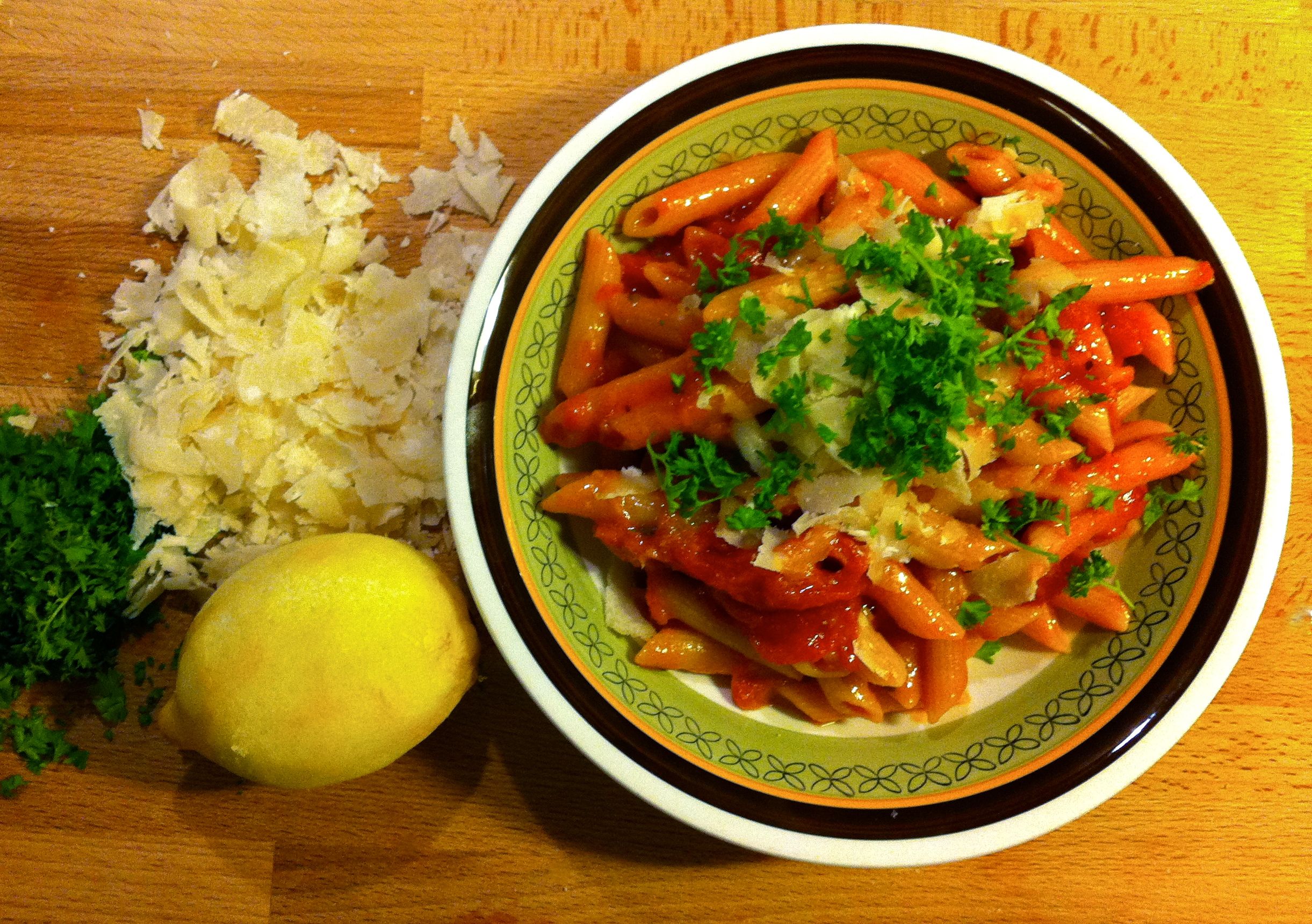 Tortellinigratäng: Dra av skinnet av 300g rå och kryddstark salsiccia. Hacka ner korvinnanmätet och fräs i lite olivolja. Slå på en skvätt rött vin (kan uteslutas) och innehållet från två små tetror pastasås med oliver (Icas egna märke, riktigt bra) och låt puttra medan du kokar 500g färsk osttortellini knappt färdig. Slå av vattnet från pastan, vänd ner tortellinin i såsen, häll allt i en ugnsform och täck med riven ost. Gratinera i ugn på 200° i 20 minuter.