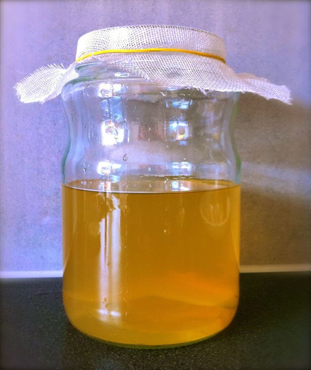 Geléklumpen som bland annat består av ättikssyrebakterier ska med tiden omvandla alkoholen till ättika. Tillgång till syra, temperatur mellan 15-30° och mörker är förutsättningar jag uppfyllt. Varje dag lyfter jag på locket och sniffar. Det verkar gå långsamt. Lilla mamman ligger i sitt vin. Jag vet inte hur hon mår.