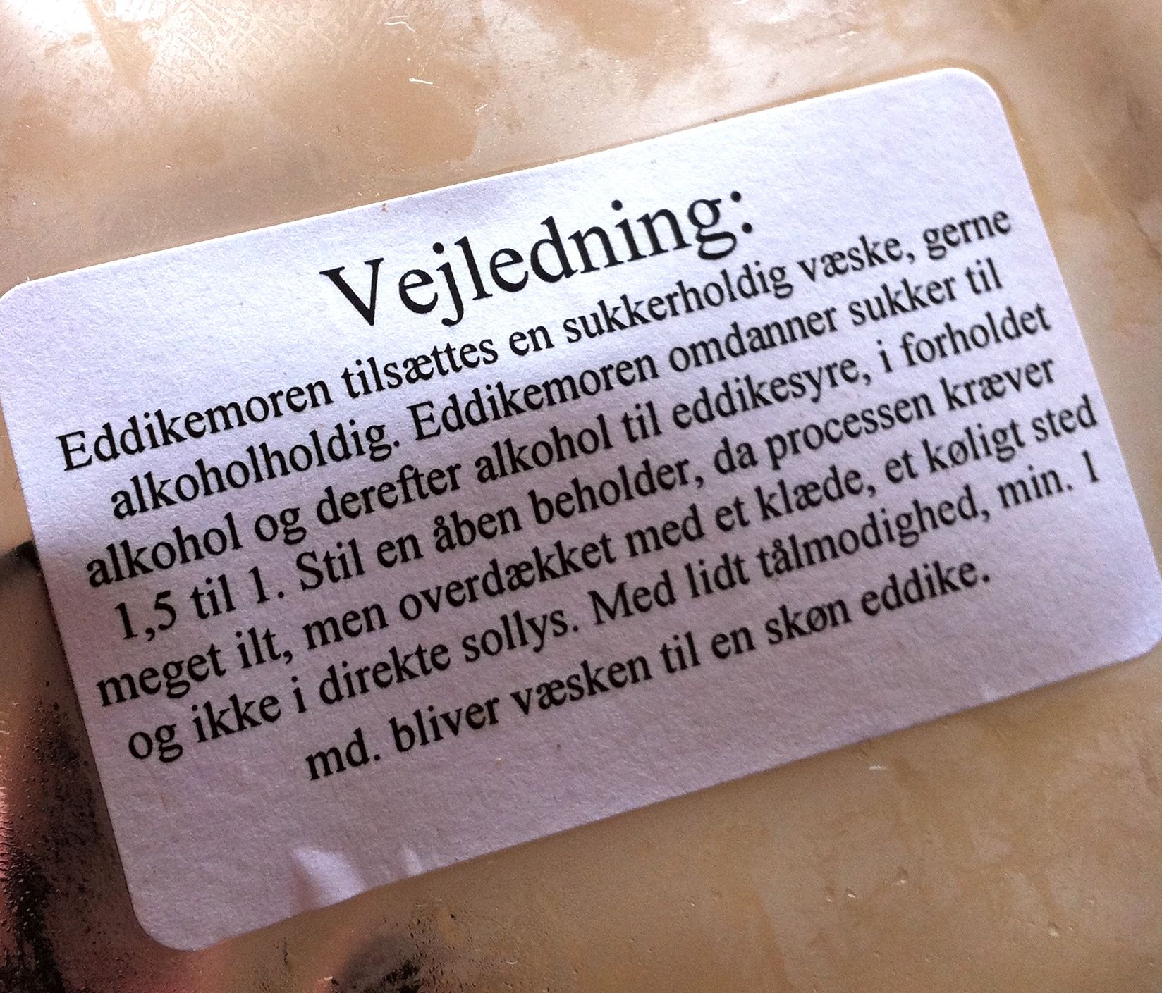 För ett tag sedan efterlyste jag en vinägermoder för att kunna göra min egen vinäger. Jag fick ett svar men då hade jag redan luskat reda på en dansk hemsida där man kunde beställa levande ”eddikemoder”. Intressant sida förövrigt där man kan hitta många spännande grejer.